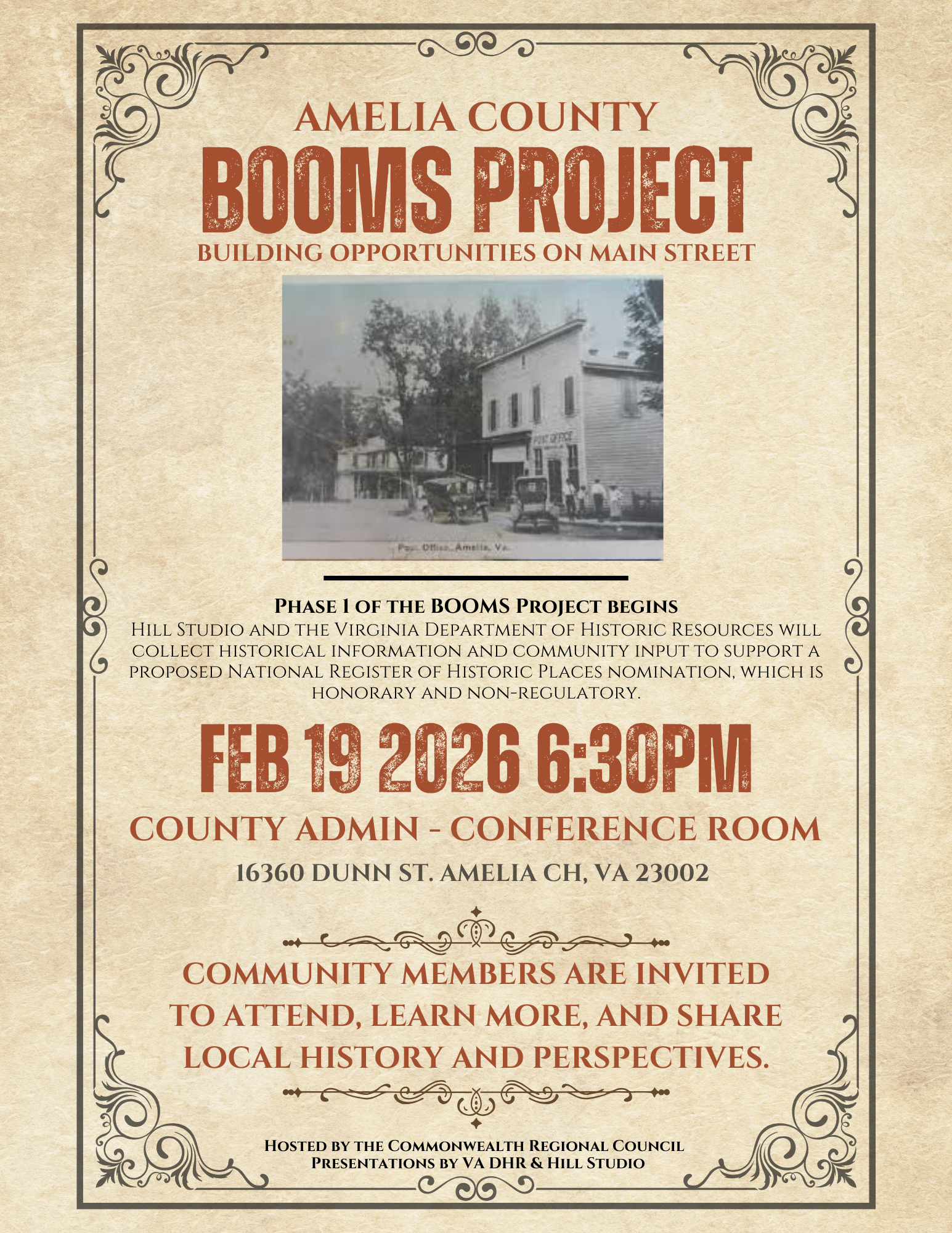 This meeting marks Phase 1 of the BOOMS Project (Building Opportunities on Main Street) and will help support a proposed National Register of Historic Places nomination, which is honorary and non-regulatory.